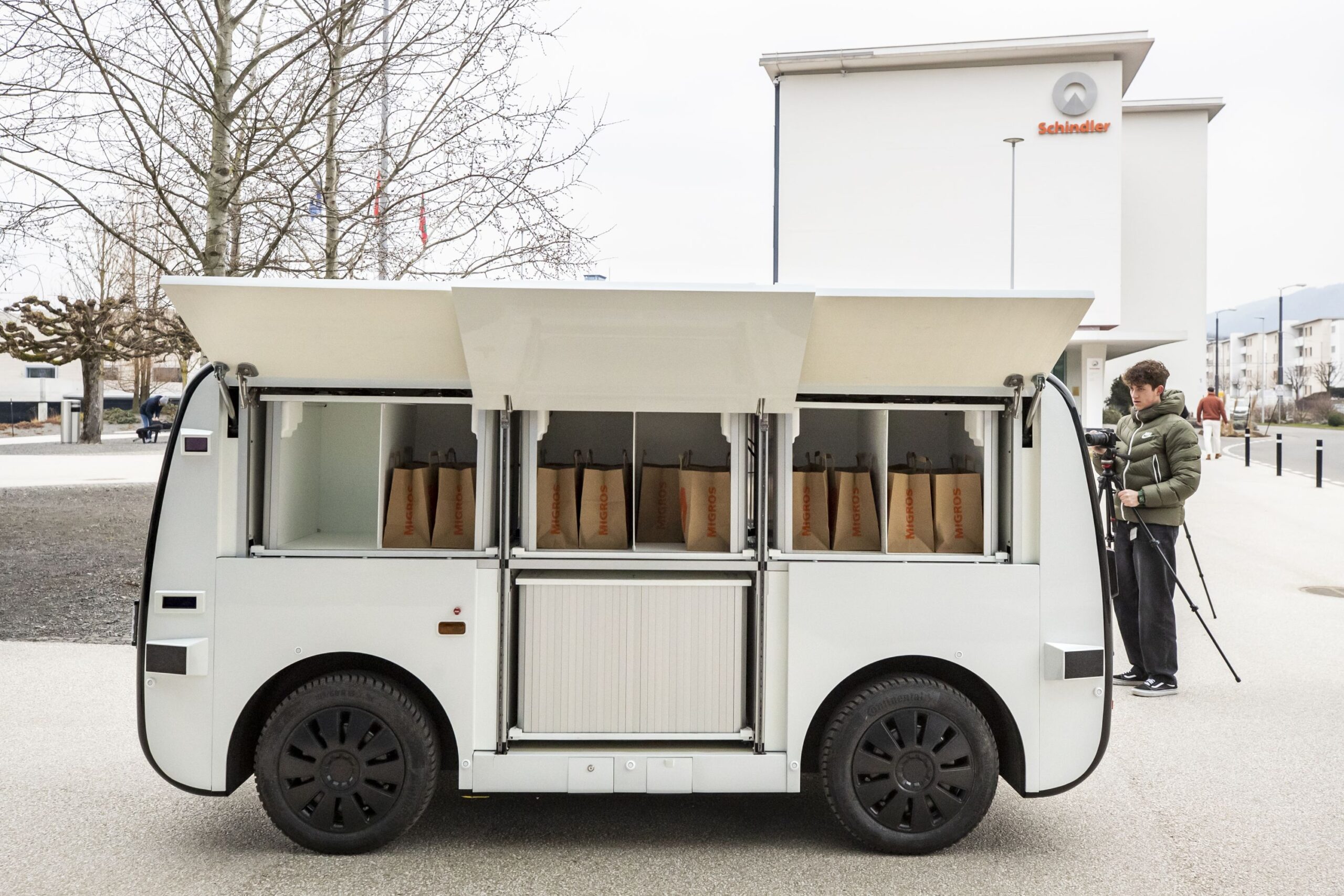 And this is how it works: following a straightforward online ordering process, the products that have been requested from Migros are loaded into the delivery vehicle. The “LOXO Alpha” then sets off to cover the 500 meters to Schindler’s site where it supplies the respective items.